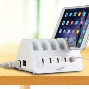 Tyylikäs viiden yksikön latauslaite pöydälle. USB latauksen lisäksi kaksi 240 V ulostuloa.