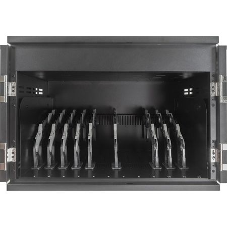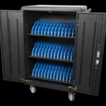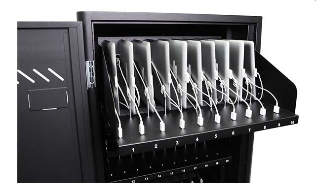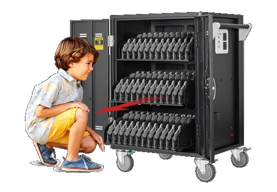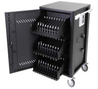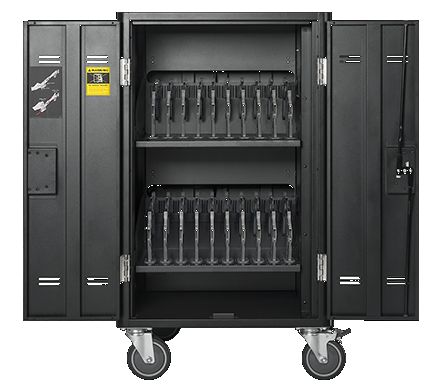 Suuri 36 yksikön nerokas latausvaunu. Kolme ulosvedettävää hyllyä joissa erinomaiset kaapelitiet. Hyllyjen lokerot ovat säädettävissä. Virran ulosotto ja latauksen monitorointi kaapin kyljestä. Kolme alueinen älykäs lataus. 3-pistelukitus.